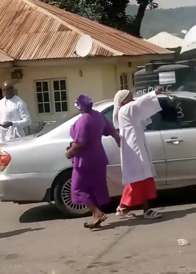 procession of people on a street next to a light-colored house with a corrugated roof. The procession moves from left to right, with individuals wearing religious garments including white robes, a purple dress, and two individuals in green robes. One person holds an umbrella over the person in the white robe, while another carries a sunburst-shaped object, likely a monstrance. A silver car is parked on the side of the road. Other buildings and some trees are visible in the background. The ground is asphalt.