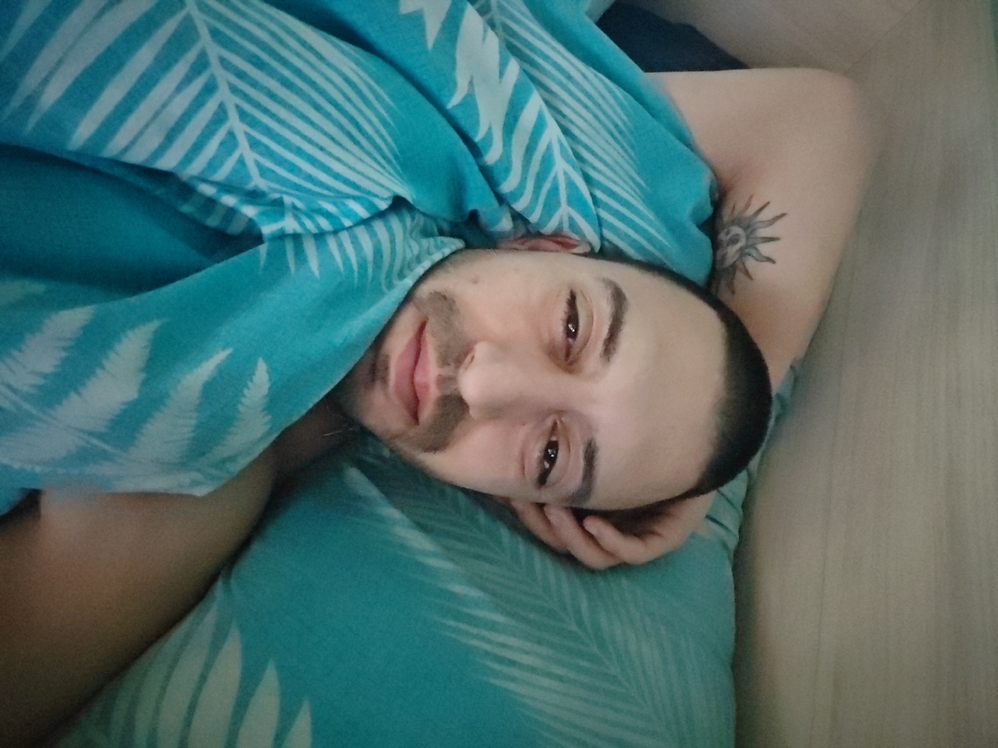 An adult male subject is depicted lying on his left side in an indoor setting, likely a bedroom. His head is supported by a turquoise pillow featuring white leaf patterns. He is partially covered by a matching turquoise blanket with similar white leaf designs, draped over his torso and right shoulder. The subject has short, dark hair, dark eyebrows, and a light beard/stubble. His eyes are open and directed towards the camera, and his lips are slightly parted. A tattoo of a stylized sun with a facial expression is visible on his left upper arm/shoulder. The immediate background consists of a light beige or off-white wall or headboard. The precise geographic location in the city of Bozhurishte, Bulgaria, is not discernible from the image content.