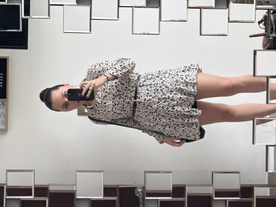 An adult female stands facing a mirror, capturing a selfie with a smartphone, in an indoor setting located in Santa Clara Ocoyucan, Mexico. She has dark hair styled in a high bun. Her attire includes a long-sleeved, cream-colored dress featuring a black floral/leaf pattern, cinched at the waist by a thin black belt. Black shorts are visible beneath the dress hem. Accessories include gold hoop earrings, a turquoise ring on the left index finger, a blue beaded bracelet on the left wrist, and a gold-toned ring on the right ring finger. A small black shoulder bag is worn across her body. The woman holds a black smartphone, featuring a case with "AV" initials, in her left hand. The background behind the woman, as seen in the reflection, is a white wall. To the left, a vertical decorative structure consists of alternating dark brown and mirrored rectangular panels. To the right, the wall is adorned with a staggered arrangement of rectangular mirrored tiles. Visible in the upper reflection are a white sign with reversed black text and a black frame. On the lower right, a surface with miscellaneous small objects is partially reflected.