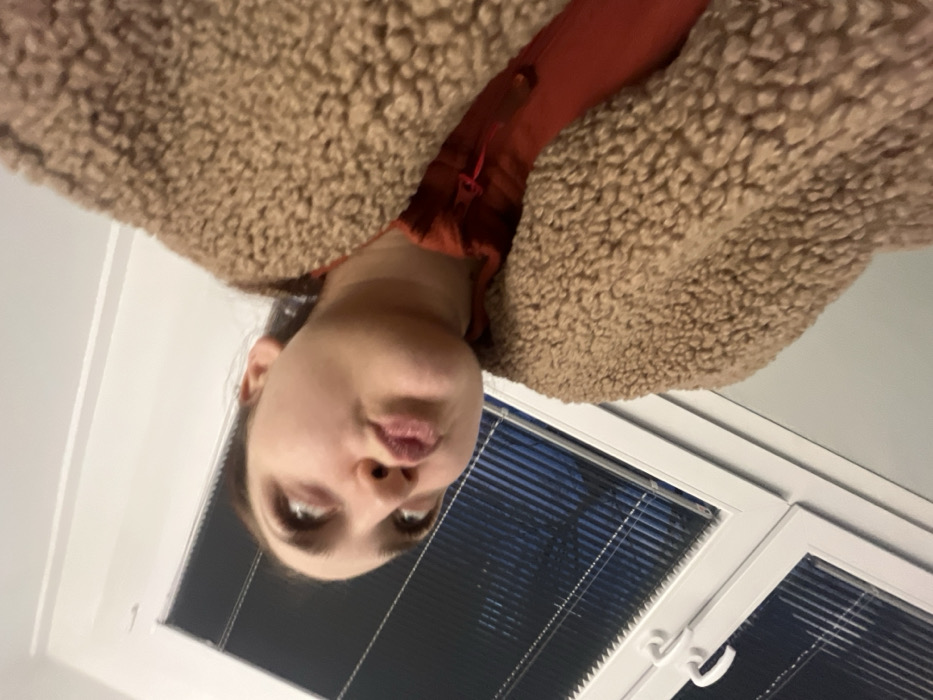 An upside-down selfie shows a person with fair skin wearing a fuzzy, tan-colored jacket over a red shirt