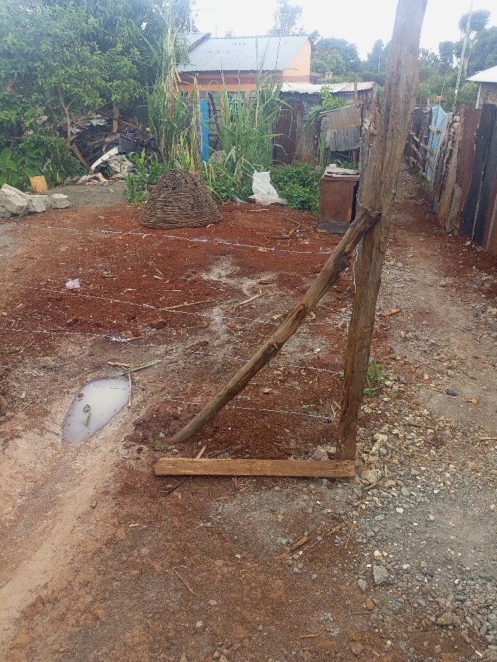 This image depicts an outdoor scene in Murera ward, Kenya, characterized by a predominantly reddish-brown earth ground. The foreground features a dirt path, with a section on the left containing a small, irregularly shaped puddle of whitish liquid. To the right, the path transitions to a mix of reddish earth and light grey gravel. A rudimentary fence structure, composed of a vertical wooden post, a diagonal wooden brace, and a horizontal wooden plank at its base, occupies the lower-right and center-right foreground. Multiple strands of barbed wire are strung horizontally across the mid-ground. In the mid-ground, centered left, a large, dark brown, conical woven basket rests on a small mound of reddish soil. To its right, a crumpled white plastic bag is visible. Further right, adjacent to a series of corrugated metal structures, stands a small, dark wooden cabinet or chest. The background is dense with varied green vegetation, including trees and tall grasses. Beyond the vegetation and makeshift structures, a building with an orange-colored wall and a grey corrugated metal roof is partially visible. The scene is devoid of any individuals, actions, or direct interactions.
