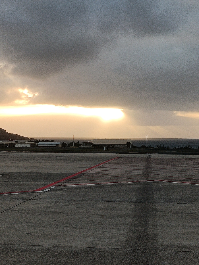 The image depicts an outdoor scene at Gran Canaria Airport (GCLP) in Ingenio, Gran Canaria, Spain, during either sunrise or sunset. The sky is dominated by a heavy, dark grey cloud cover. A horizontal band of intense, golden-orange sunlight pierces through the clouds at the horizon, casting distinct crepuscular rays upwards and reflecting off the water. The foreground consists of a wide expanse of dark grey asphalt or concrete pavement, consistent with an airport runway or apron. Distinct red and white painted lines mark the pavement, curving towards the left in the middle distance. A long, dark, vertical shadow extends from the bottom center of the frame across the pavement towards the horizon. In the midground, several low-rise airport buildings or hangars with light-colored roofs are visible, interspersed with sparse, dark vegetation. Beyond these structures, the dark blue surface of the Atlantic Ocean stretches to the horizon. A low, dark mountain range is visible on the far left horizon. Two slender light poles are present in the midground, silhouetted against the sky.