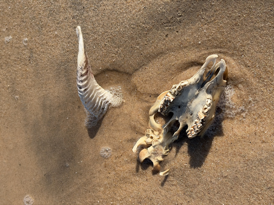 - "On a sandy beach in Alaguntan, Nigeria, a weathered animal skull and a curved, ridged bone fragment are partially submerged by tidal foam" by FM-rkm0j2, licensed under CC BY 4.0