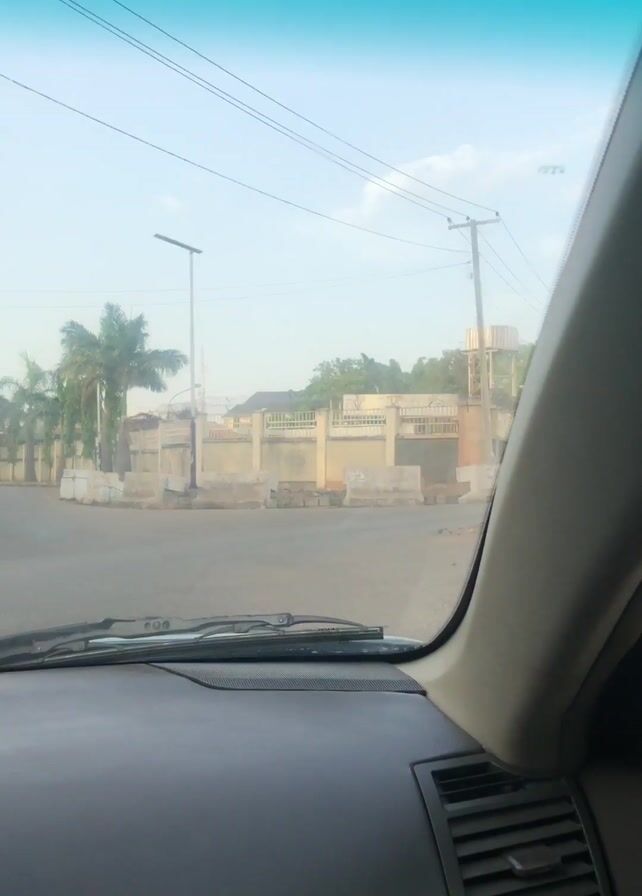 view from inside a car driving down a street. The dashboard and windshield are visible. Stickers and an air freshener hang from the rearview mirror. The street is paved and lined with palm trees and buildings behind white walls. Another car is seen driving in the opposite direction. The sky is hazy blue. The video appears to be taken during the day. The car turns slightly to the left.