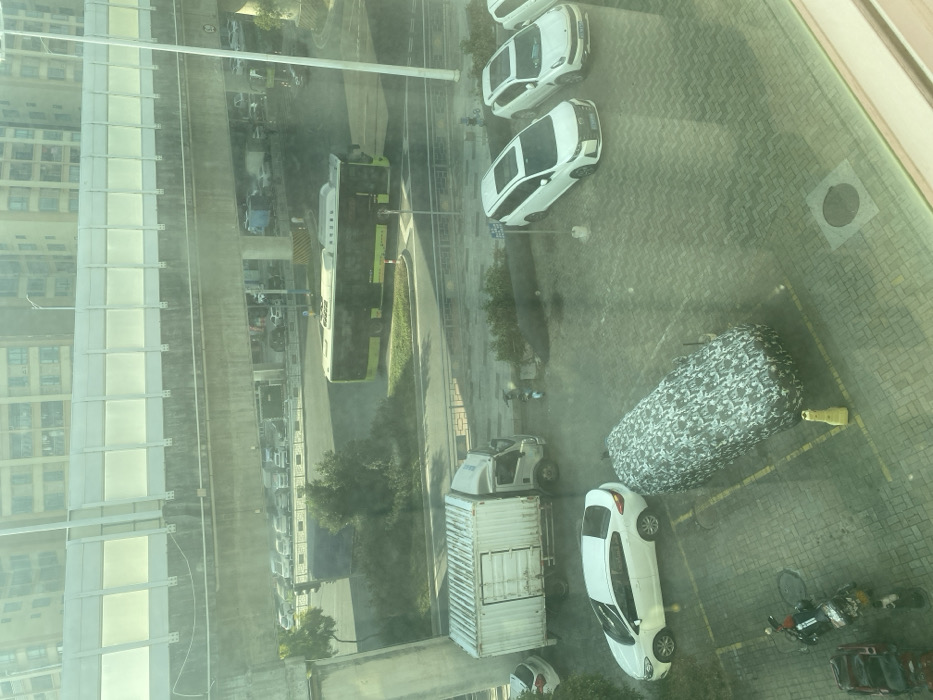 An aerial view captures a mix of vehicles and infrastructure. A green bus and several white cars are parked. A truck with a white container is also visible. A vehicle is covered by a camouflage tarp. Motorcycles and a red vehicle occupy the corner of the lot. A building with a skywalk runs parallel to the road. The scene is viewed through a reflective window, giving the image a slightly hazy quality.