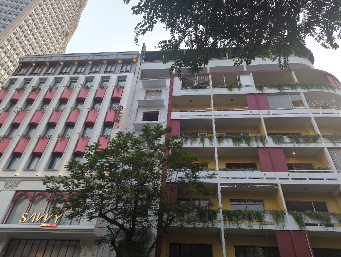 The image displays an urban scene in the city of Thủ Đức, Vietnam, featuring two distinct multi-story buildings viewed from a low angle. The left building, identified by a gold sign as "SAVVY HOTEL BY HERA," has a white facade with prominent diagonal red panels, each containing small green plants. The upper section of this building features a dark grey roofline with lighting. To the right, an adjacent building exhibits a pale yellow facade with white balcony railings and vertical maroon architectural accents. Trailing green plants cascade from the balconies of this building. A tree with green foliage partially obscures the lower and mid-sections of both structures, while darker tree branches are visible overhead against a light sky. In the upper left background, a tall, textured skyscraper is partially visible. No individuals or specific actions are depicted.