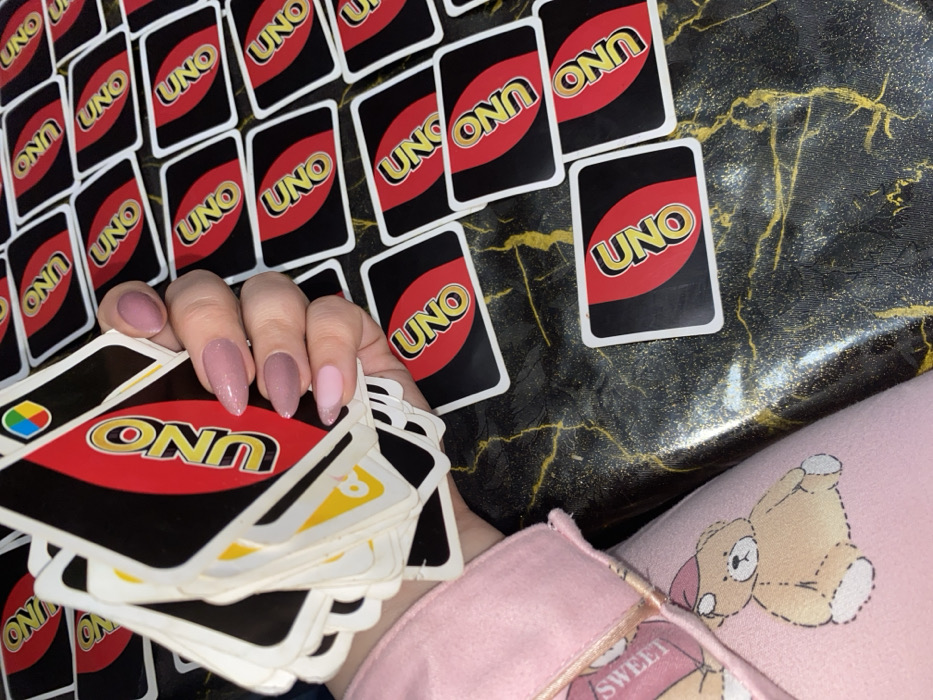 An overhead view captures a human hand holding a fanned stack of UNO playing cards, positioned over a dark, glossy table surface covered with numerous other face-down UNO cards. The location is an indoor setting in Unknown, Unknown. The visible hand, identified as a right hand, exhibits long, manicured nails. The thumb and index finger feature a light pink, glittered nail polish, while the middle, ring, and pinky fingers are painted with a dusty rose or mauve glittered polish. The hand holds approximately 10-15 UNO cards, fanned out, with the top card displaying the classic black and red UNO logo and a multicolored wild card symbol. Scattered across the dark table surface, which possesses a golden, marbled or veined pattern and a reflective sheen, are dozens of additional UNO cards, all face down, revealing their black and red "UNO" branded backs. In the bottom left of the frame, a soft, pink fabric object is partially visible. This object appears to be a piece of clothing or bedding, featuring a graphic of a light brown teddy bear wearing a red hat, with the word "SWEET" partially legible above its head. The overall scene suggests a casual indoor activity involving the card game UNO.