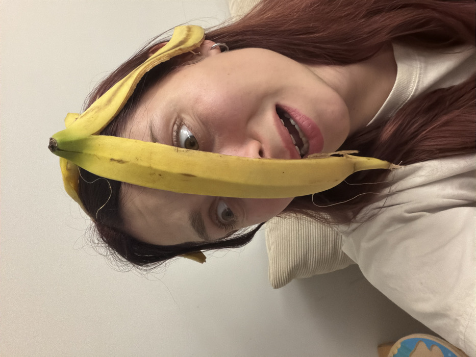 - "A woman lies sideways with a banana peel atop her head" by FM-tVHr02, licensed under CC BY 4.0