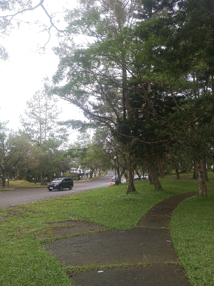 This image, captured in Babaliya Mal., India, depicts an outdoor environment under an overcast sky. A dark, winding asphalt pedestrian path is visible in the foreground on the right, bordered by green grass. An asphalt road curves from the left midground towards the right background. A black SUV is observed in motion on the left side of the road, proceeding away from the viewer. Numerous trees with green foliage line both sides of the road, creating a dense canopy. Distant buildings with white facades are partially visible through the trees on the left. Several parked vehicles are discernable further along the road on the right, where an orange and white barrier or sign is also present. No individuals are visible in the scene.