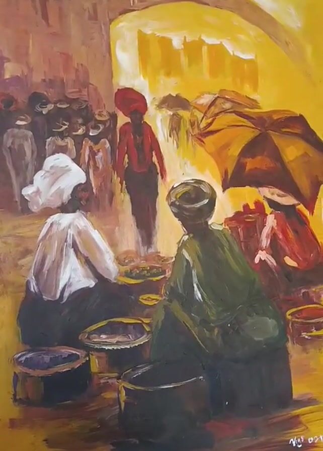 painting depicting a busy market scene. In the foreground, three women are seated around several metal pots. One woman wears a white head covering and a white shirt, another wears a green garment and a green head covering. The third woman wears a red garment and sits beneath a large umbrella. In the background, a large crowd of people is gathered beneath a large stone archway. One person stands out wearing a red turban and a red jacket. The painting is done in an impressionistic style with warm, earthy tones. The background is blurred and indistinct, creating a sense of depth. The overall impression is one of a vibrant and lively market scene.