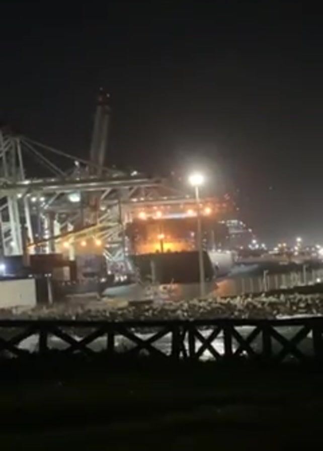 brightly lit harbor at night. Several large cranes are visible, and a large ship appears to be docked, with many containers stacked on its deck. A street light is prominent in the foreground. A fence runs along the bottom of the view, separating the viewer from the harbor area. The night sky is dark.