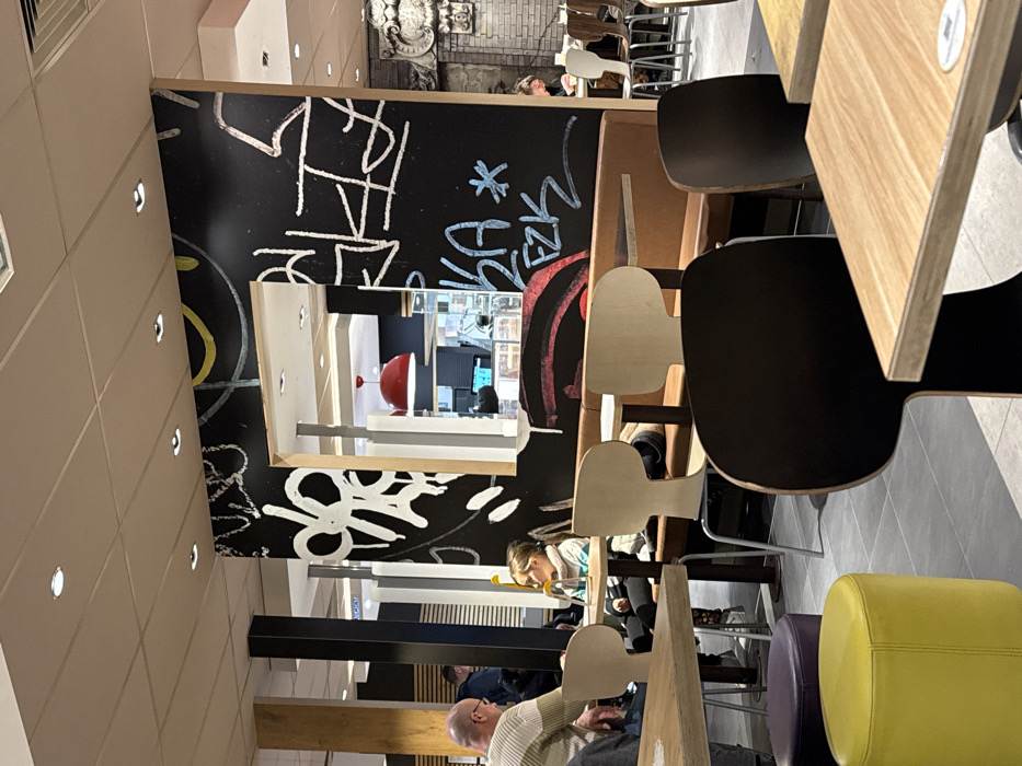 A fast-food restaurant interior shows seating areas with graffiti-covered walls. Tables with wooden tops and black chairs are visible. Some customers are seated, while others are in the background. Yellow and purple poufs serve as additional seating options. The scene captures a casual dining environment with a modern, artistic touch.