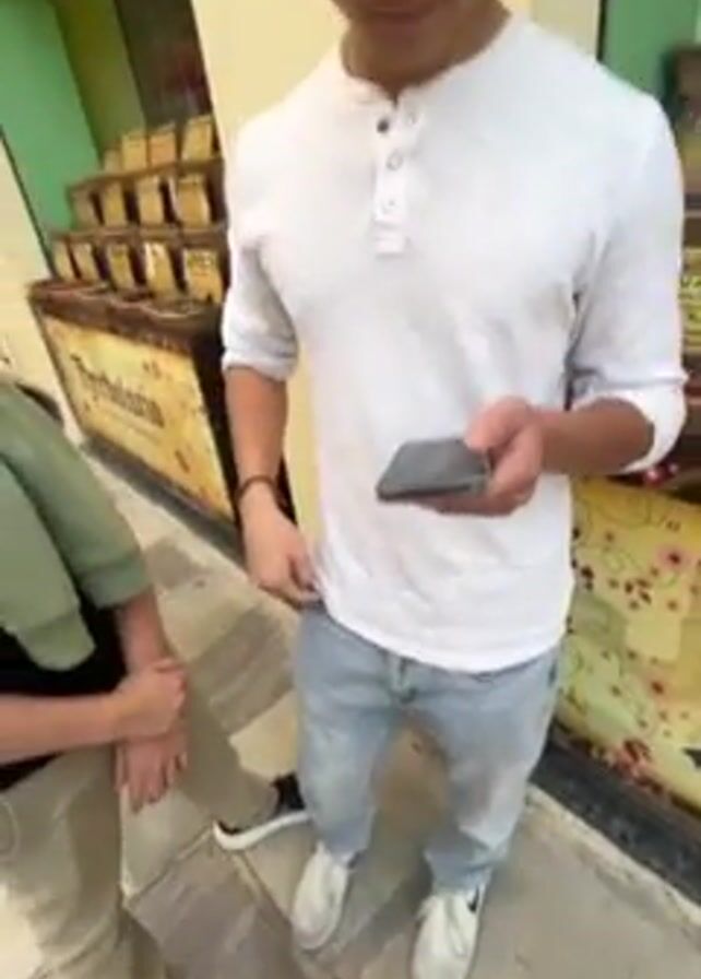 The scene appears to be set outdoors, possibly on a street or sidewalk. The ground is paved with stone blocks. In the background, there is a building or shop with a display of what seems to be packaged goods. The sign above the goods is in a foreign language. **People:** There are two individuals visible in the video: * **Person 1:** A younger individual wearing a black shirt, beige pants, and black shoes. They have a light green sweater tied around their shoulders. * **Person 2:** An older individual wearing a white long-sleeved shirt, light blue jeans, and white shoes. This person is holding a smartphone. **Objects:** * **Smartphone:** The older individual is holding a smartphone, presumably filming the interaction. * **Sweater:** The younger individual has a light green sweater tied around their shoulders. * **Packaged Goods:** There are packaged goods displayed in the background. * **Building/Shop:** There is a building in the background. **Actions/Interactions:** * The older individual is holding a smartphone and appears to be showing something on the screen to the younger individual. * The younger individual is looking at the phone. * At the end of the video a hand comes into the shot and shoves the younger individual. **Environment:** The environment appears to be a commercial or tourist area. The lighting suggests it is daytime.