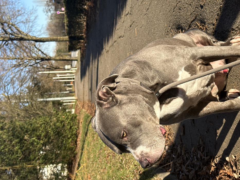 A blue-grey "Blue Nose" Pit Bull type dog, exhibiting white markings on its muzzle, chest, and paws, sits on an asphalt pedestrian pathway