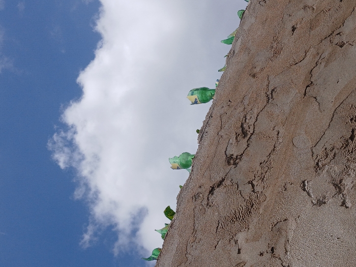 A textured, light-brown wall is viewed from below, its top edge lined with the broken tops of green glass bottles. The wall is set against a bright blue sky with large, fluffy white clouds. The angle of the shot emphasizes the wall's height, with the sky and clouds providing a stark contrast to the rough texture and color of the wall and the sharp edges of the glass bottles.