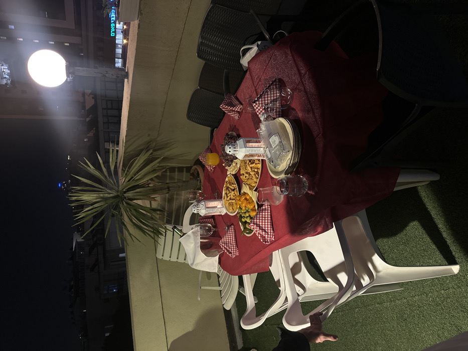 A red-covered table dominates the scene, set with plates, glasses, and checkered napkins. Platters hold snacks like grapes, tomatoes, and fried items. Lanterns act as decorative centerpieces. White chairs surround the table. A large potted plant stands near the table, adding a touch of nature. In the background, buildings are illuminated by streetlights and signs.