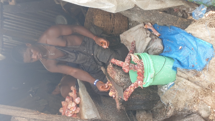 The image depicts a male engaged in meat preparation within a makeshift stall in a market setting, located in Onitsha, Nigeria