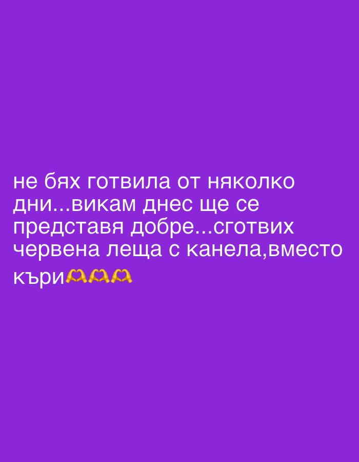 The image displays white Cyrillic text centrally positioned on a solid purple background. The text, written in Bulgarian, translates to: "I hadn't cooked for several days...I thought today I'd do well...I cooked red lentils with cinnamon, instead of curry." The text is followed by a pot of food emoji and three yellow heart emojis. The scene depicts no visible people, specific objects other than the text and emojis, or actions beyond the implied act of writing this statement. The environment is an abstract, uniform purple digital canvas. The image contains no visual elements, geographical indicators, or explicit textual references to a specific location within the city of Targovishte, Bulgaria.