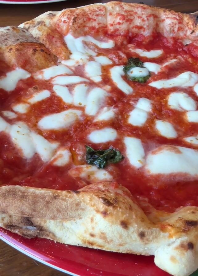 - "close-up of a Margherita pizza on a red and green plate, sitting on a wooden table" by FM-8YX5o2, licensed under CC BY 4.0