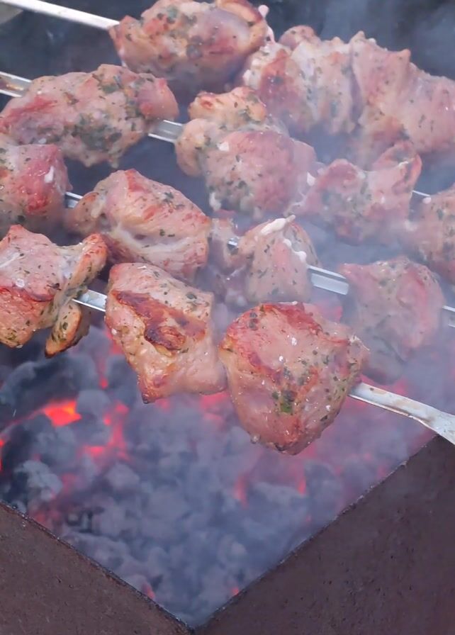 close-up of raw meat cooking on skewers over hot, glowing charcoal in a square, metal brazier. The meat, appearing to be pork, is cut into chunks and seasoned with herbs. Smoke rises from the hot coals and partly cooked meat. The brazier sits on the ground outdoors.