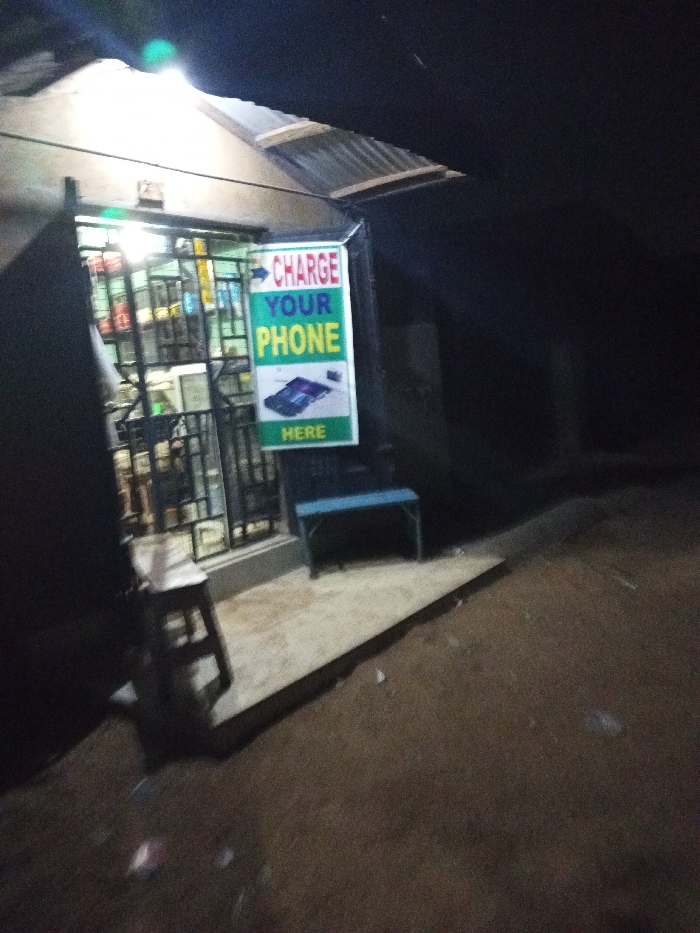 A dimly lit storefront at night. A sign reads "CHARGE YOUR PHONE HERE" with a phone graphic and directional arrow. The shop's interior is visible through a barred window, revealing shelves filled with various items. A small wooden stool sits outside the door. A short blue bench is near the sign on a concrete slab. The surrounding area appears dark, with a road surface in the foreground.