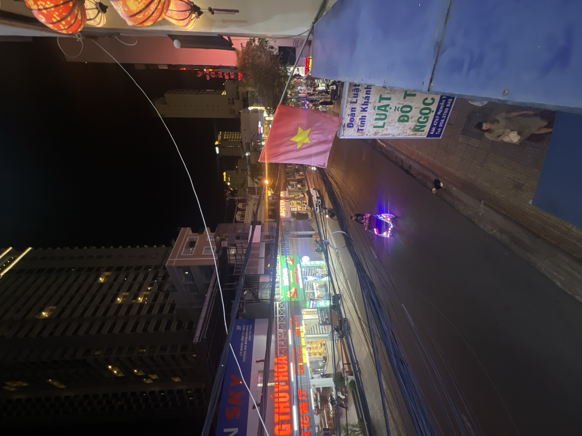The image, taken at night in Nha Trang, Vietnam, shows a street scene from an elevated perspective