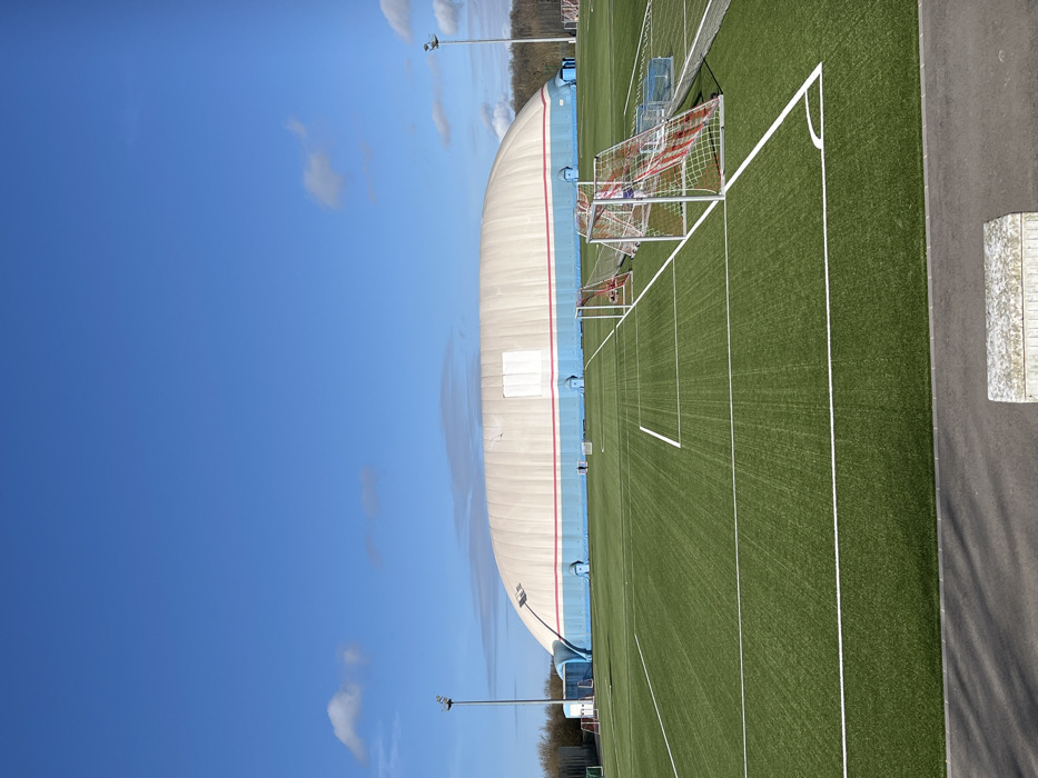 This image depicts an outdoor sports facility located in Mondercange, Luxembourg, under a clear blue sky with sparse white clouds. The primary subject is a large, elongated, inflatable dome structure in the background, colored predominantly off-white with a horizontal blue band and a thinner red stripe encircling its base. Several small, cylindrical blue protuberances are visible along the dome's base, and a large rectangular white panel is present on its surface. In the midground, a green synthetic turf sports field with white line markings occupies most of the frame. Multiple portable soccer goalposts are positioned on the field; two in the right foreground feature white frames with red and white netting, respectively. Additional smaller goalposts are visible further left. Two tall, metal floodlight poles stand on either side of the field, extending above the dome structure. Distant trees form a faint treeline behind the dome. The immediate foreground shows a gray paved area and a partially visible light-colored rectangular block, possibly a concrete bench or barrier. No individuals are visible on the field or within the scene. The overall scene indicates bright, daytime conditions.