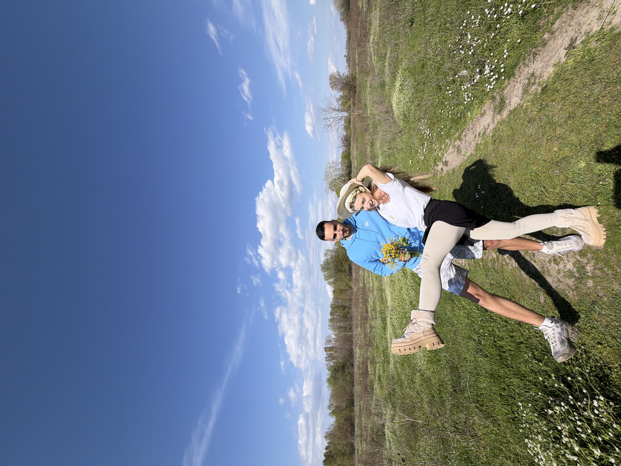 In a field near Milevo, Bulgaria, a couple lies on the grass. The woman is wearing a white shirt, black shorts, beige leggings, and a hat. The man is wearing a blue hoodie and holding yellow flowers. They are both wearing sneakers. The field is covered in green grass and small white flowers. There is a dirt path running through the field. In the background, there are trees. The sky is blue with white clouds.