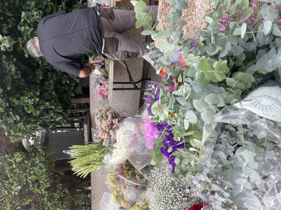 A man wearing a black shirt and grey pants is arranging flowers at a table. The scene features an abundance of flowers, including eucalyptus, purple stock, gladiolus, and baby's breath, all in plastic wrap. The flowers are positioned on a stone ledge next to lush green bushes.