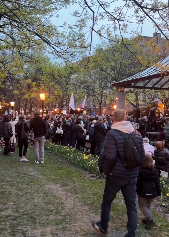 crowd of people gathered in a park, likely for a rally or event. There is a stage or platform with several people on it, including speakers. Some people in the crowd are holding flags, and there are lampposts around the perimeter of the park. The sky is overcast, and it appears to be dusk. People are walking and standing around in the crowd. The environment is urban, with buildings visible in the background.