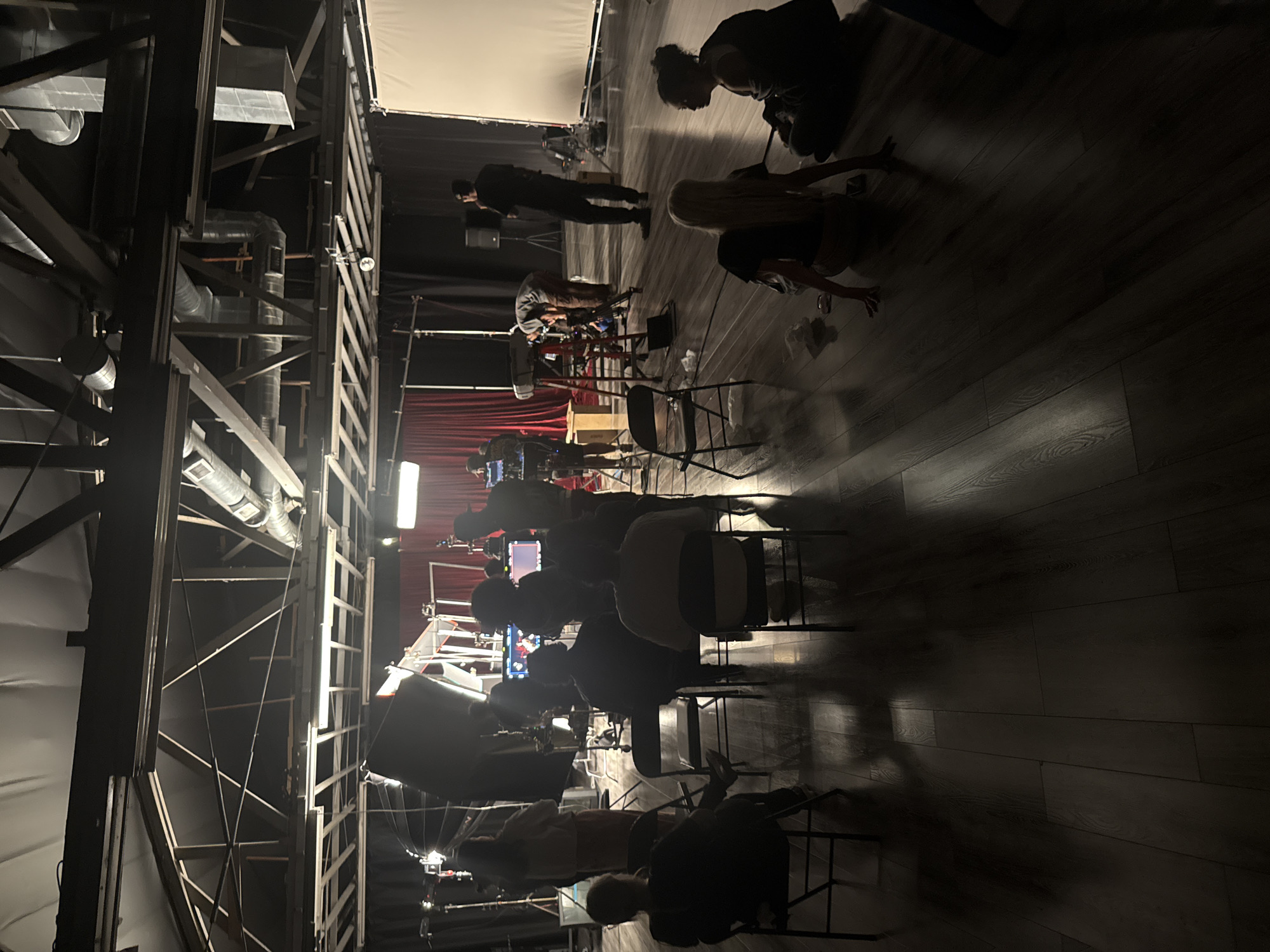 n interior scene resembling a film or television studio in Burbank, California, United States of America. A group of individuals are present, primarily seated on chairs, observing a scene being filmed or monitored on a screen. Lighting equipment and studio infrastructure, including rigging and ductwork, are visible. The floor is wood-planked. The setting suggests an active production environment. Some other people are also standing or kneeling further back.