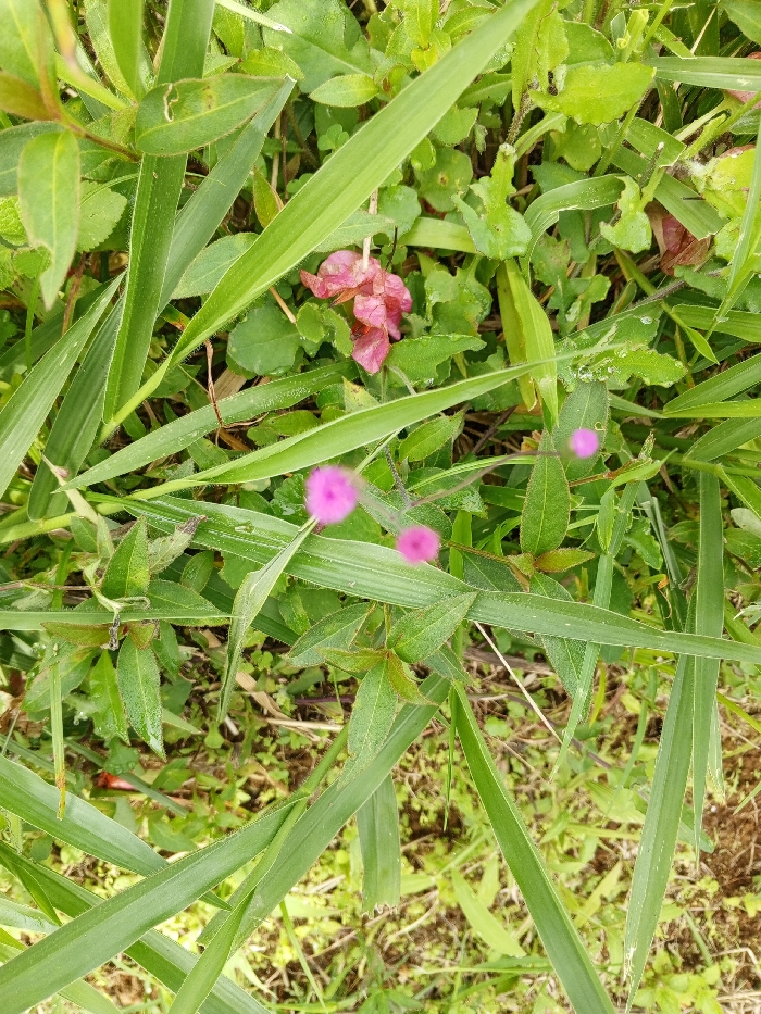 A verdant close-up reveals an intricate tapestry of nature. Long, pointed blades of grass dominate, interspersed with various green foliage. Three vibrant pink pom-pom-like flowers stand out amidst the greenery. Additionally, a cluster of faded pink blooms lies scattered near the top center. This scene offers a glimpse into the diverse flora inhabiting a lush environment.