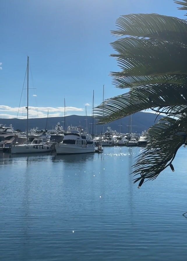 marina filled with boats on a sunny day. The water is calm and reflects the sunlight. In the foreground, the leaves of a palm tree sway slightly in the breeze. In the background, there are mountains. The sky is clear and blue with a few wispy clouds. There are no people visible in the shot.