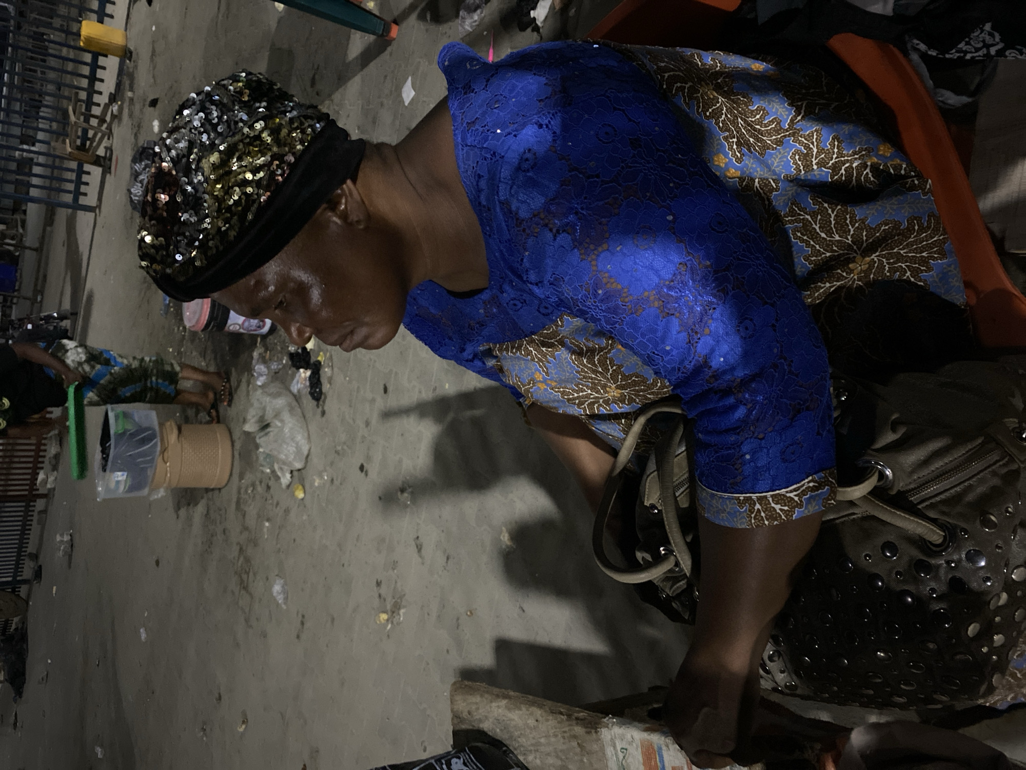 In Lekki, Nigeria, a woman wearing a sequined head covering and a blue lace and patterned fabric dress is bent over, examining or handling an object partially visible in the lower center of the frame. Her focus is downward. A studded bag sits beside her. The ground is littered with debris. Other people and objects, including a woven basket and plastic bags, are visible in the background.