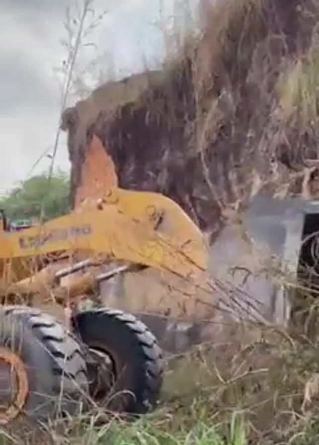 yellow LIUGONG front end loader scooping earth from the side of a hill covered in grass and weeds