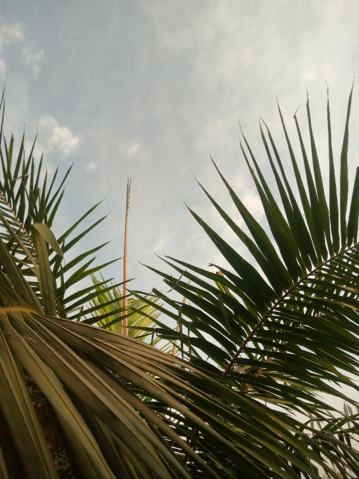 - "The image displays an upward view into a pale blue sky with scattered white cumulus clouds, framed by dense palm foliage, located in Gaklang, Nigeria" by FM-NsadP2, licensed under CC BY 4.0