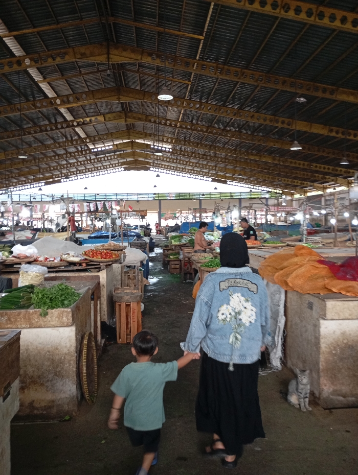 The image displays an active indoor fresh produce market in Soreang, Indonesia. A high, corrugated metal roof supported by extensive yellow-painted metal trusses spans the space, with numerous suspended light fixtures providing illumination. Gaps in the roof structure allow ambient natural light. In the foreground, a woman, viewed from behind, wears a black hijab, a light blue denim jacket with white floral embroidery on the back, and a long black skirt. She holds the right hand of a young boy, also seen from behind, who wears a short-sleeved teal shirt and dark shorts. They are walking away from the viewer along a market aisle. To their left and right are numerous stalls with concrete or wooden counters displaying fresh vegetables, including green leafy produce and red tomatoes, alongside other items in baskets and containers. Other individuals, both vendors and shoppers, are visible further into the market. A grey tabby cat is seated on the dark, uneven concrete floor to the right of the woman, near a stall. Wooden crates and a round woven tray are visible among the market stalls.