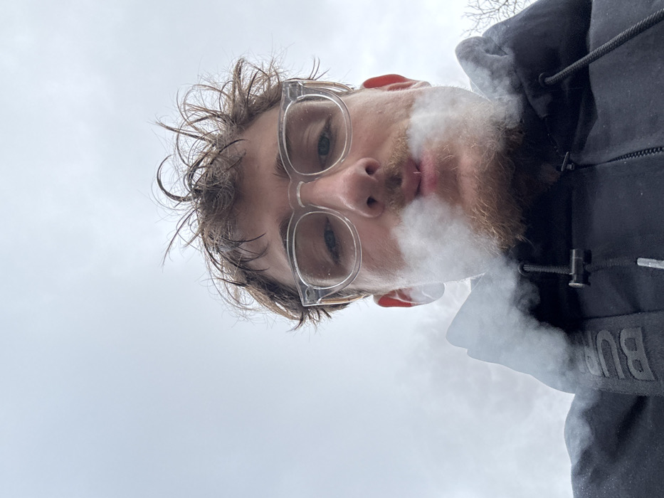 An upward-angled close-up depicts a male individual with messy, light brown hair, a mustache, and a short beard. He wears clear-framed eyeglasses and a dark hooded jacket with a visible zipper and drawstrings. A black strap with partially visible text "BURB" (likely Burberry) is present over his left shoulder. The individual is exhaling a dense plume of white vapor or smoke that partially obscures his lower face and extends downwards. The background consists of an overcast sky, with bare tree branches faintly visible on the right. The scene takes place outdoors in Vincennes, France.