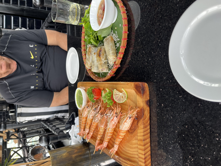 A dining scene is depicted at a restaurant in Hà Nội, Vietnam. A male individual, visible from the chest down, is seated at a dark, speckled table, wearing a black Nike t-shirt. On the left side of the table, a rectangular wooden serving board holds seven cooked, reddish-orange prawns or large shrimp, each with heads and tails intact, arranged in a row. Accompanying these are a small white bowl of green dipping sauce, two half-slices of lime, and sprigs of green herbs with two red cherry tomato halves. To the right, a round woven bamboo tray with a red trim contains four fried spring rolls, presented on a green leaf and surrounded by fresh green herbs. A small white bowl filled with a reddish-brown dipping sauce, featuring visible particulates, sits beside the spring rolls. A clear glass containing water is positioned to the right of the spring roll tray. Two empty white ceramic plates are on the table: one directly in front of the seated person, and another partially visible in the bottom right corner. A dark cylindrical container holding chopsticks stands on the far left. A smartphone is partially visible on the table, near the chopsticks. The background features dark restaurant furniture, including chairs with black and white striped cushions.