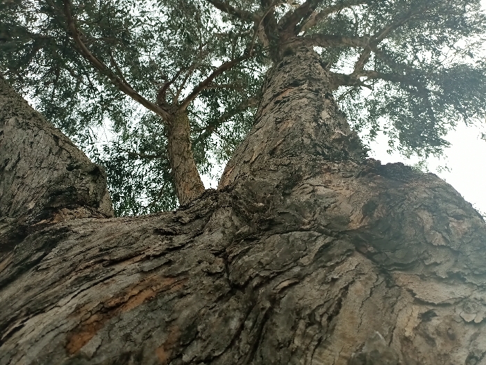 The image showcases a towering tree viewed from a low angle. Rough, textured bark dominates the foreground, with the trunk extending upwards. Branches reach towards the sky, partially obscuring a light, overcast sky. Foliage is visible, creating a canopy effect. The perspective emphasizes the tree's height and the intricate details of its bark.