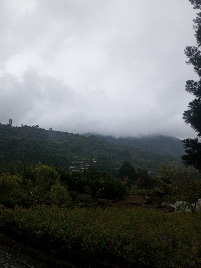 The image depicts a cloudy day over a green, mountainous landscape. Terraced hills rise in the distance, partially obscured by low-hanging clouds. In the foreground, a garden or nursery-like area is visible, with rows of plants and shrubs. A tall evergreen tree stands on the right, framing the scene. The overall atmosphere is damp and overcast, with a muted color palette.