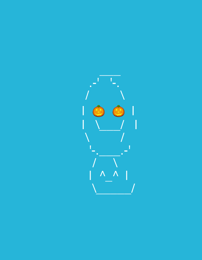 The image displays an ASCII art-style figure against a plain blue background. The figure, composed of white lines, features two orange pumpkin emojis acting as eyes within a head-like structure, a mid-section, and a base. No individuals or specific real-world objects are depicted, nor are any actions or interactions observable. The environment is a uniform blue field. The image provides no visual information to ascertain a specific geographical location within the city of Raanana, Israel, or any other physical place.