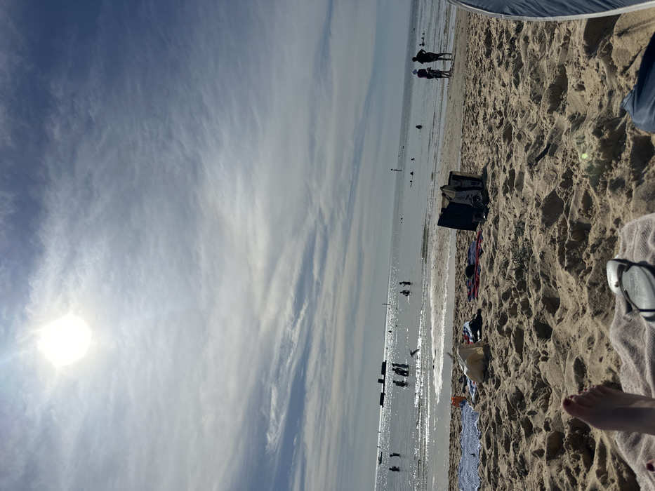 A beach scene under a bright, partly cloudy sky with the sun low on the horizon. People are seen at the water's edge, some silhouetted figures are in the distance. The foreground displays sandy beach, a person's foot, sunglasses, and personal belongings including clothes and bags. A section of a beach tent is visible at the upper edge.