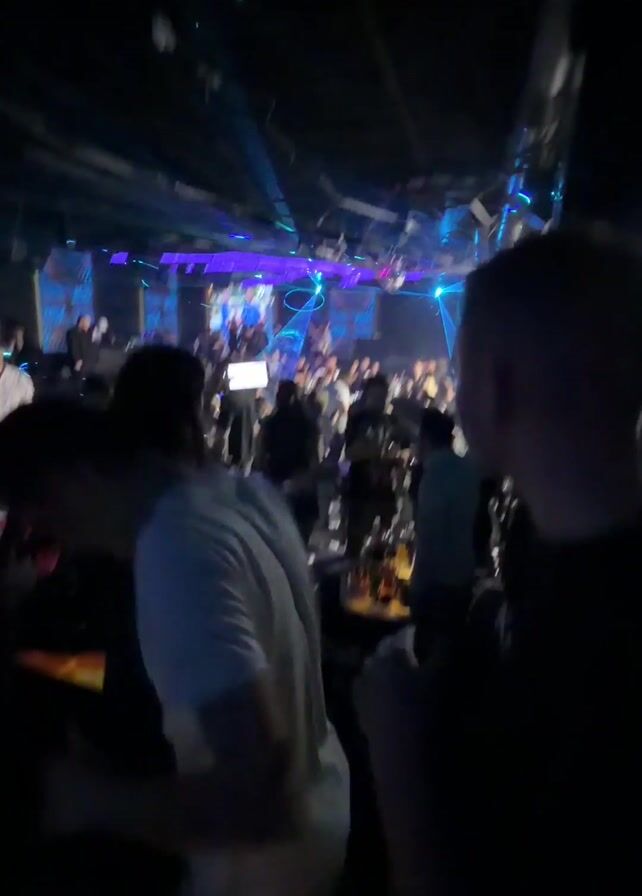 crowded nightclub atmosphere, filled with dancing people. The lighting is dark, punctuated by bright, colorful spotlights and neon fixtures above. Many individuals are holding drinks and moving rhythmically to music playing in the background. A DJ booth is visible in the distance, with screens displaying visuals accompanying the music. Confetti litters the floor, adding to the lively scene. The camera holder appears to be standing near a bar, capturing the energy of the event.