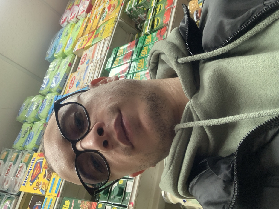 A low-angle selfie captures a male individual inside a supermarket or convenience store in Meknes, Morocco