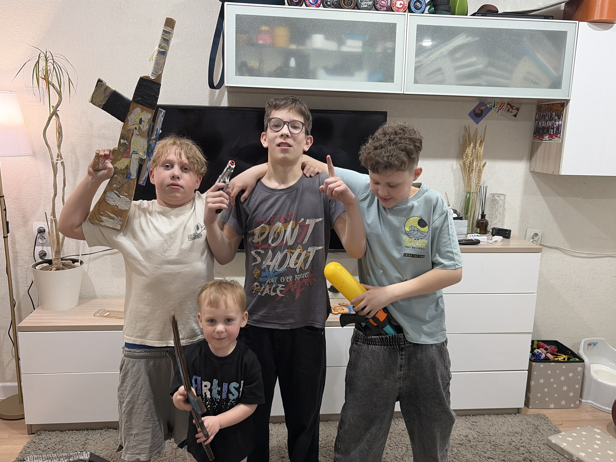 In a brightly lit interior, possibly a residence in Chaikovsky, Russia, four young boys are posed with toy weapons