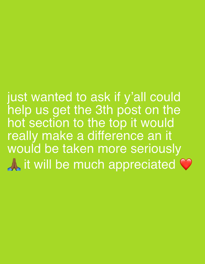 The image is a request for help to boost a post. It asks viewers to assist in getting the "3th" post on the "hot section" to the top. The motivation is that it would make a difference and be taken more seriously. The text concludes with gratitude, indicated by the phrase "it will be much appreciated," accompanied by a praying hands emoji and a red heart. The background is a bright green color.