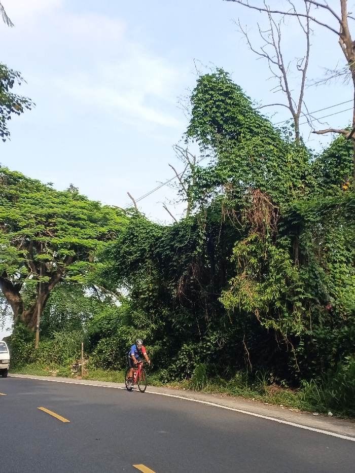 A cyclist rides a red bicycle on a black asphalt road with yellow lines. Lush green vegetation lines the road, including trees and vines that have overgrown some of the branches. A white van is parked on the roadside in the distance. The sky is a pale blue with some light clouds. The overall scene suggests a rural or suburban setting.