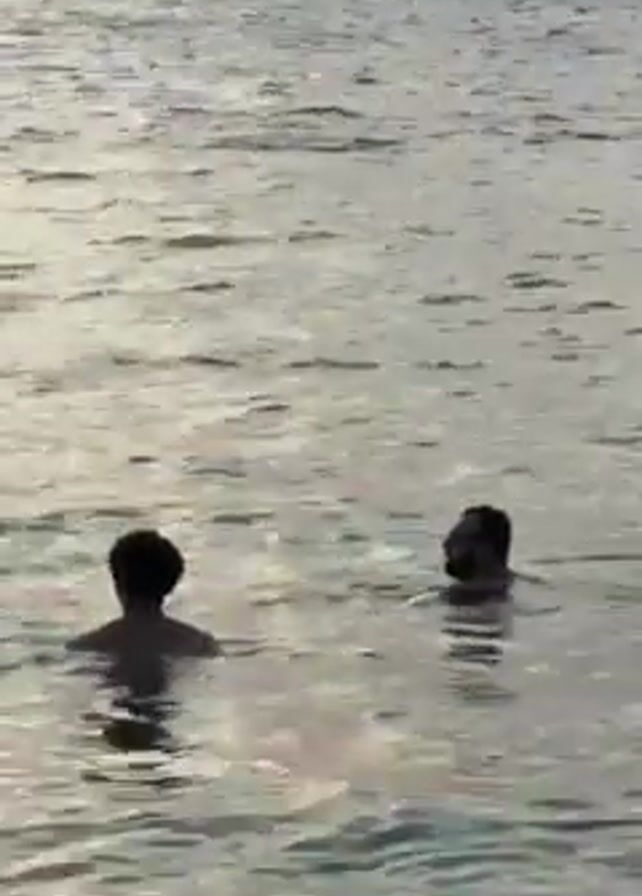 Two men are in the ocean, waist-deep. One is facing away from the camera, and the other is facing the camera. The water is shimmering in the sunlight. The horizon is visible in the background.