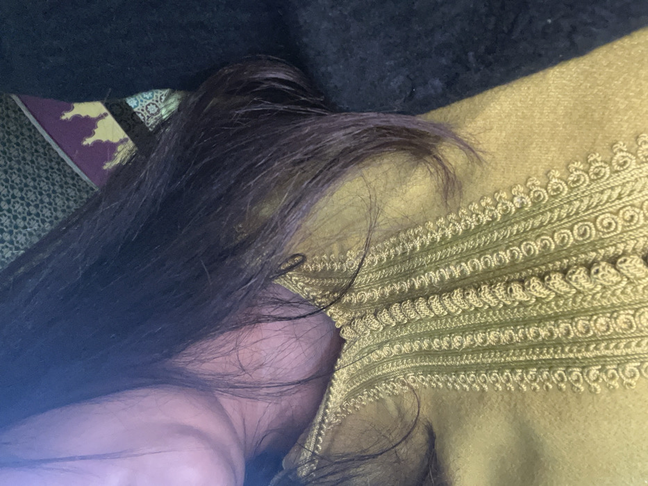 A close-up shows a person's face obscured by dark hair. Part of the person's neck and shoulder are visible. The hair rests against textured fabrics in hues of olive green and a darker color. A patterned fabric with geometric shapes and colors like dark green and gold is also present. The olive green fabric features decorative trim with rows of small, circular designs. Overall, the image has a slightly blurry, soft-focus effect.